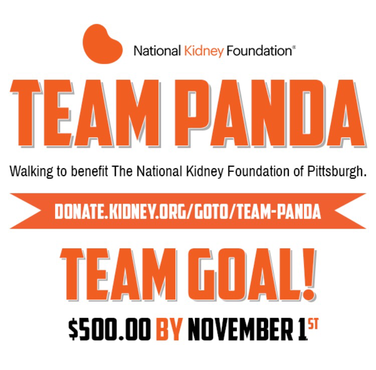 BuzzNTheBurgh will be participating in this years National Kidney Walk at the Pittsburgh Zoo on November 1st. We are looking for sponsors, donations & team members. What is our team name, not BuzzNTheBurgh, but TEAM PANDA!